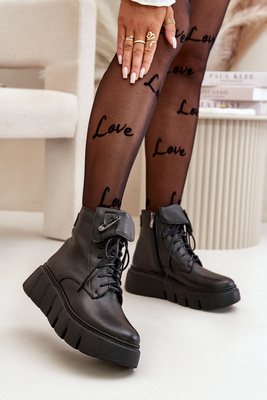 Zazoo 60511 Skórzane Botki Damskie Na Platformie Ocieplane Czarne