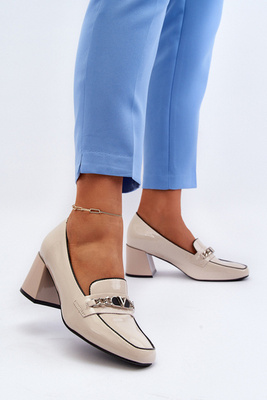 Lakierowane Czółenka Na Niskim Obcasie Z Ozdobą Beżowe Makki