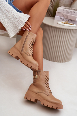 Damskie Workery Botki Na Zamek Sznurowane Z Eko Skóry Beżowe Naolani