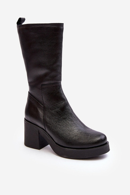 Damskie Skórzane Kozaki Na Masywnym Słupku Czarne Lemar Odennia
