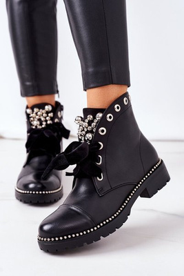 Ocieplane Botki Z Metalowymi Perełkami, Dżetami I Wstążką Czarne Perla