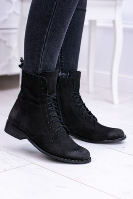 Ocieplane Skórzane Czarne Damskie Botki Z Koronką Millano