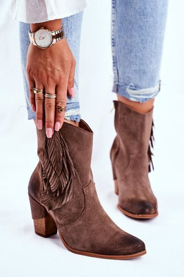 Botki Damskie Na Słupku Skórzane Welurowe Kowbojki Exquisite Brązowe 1170
