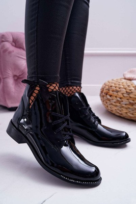 Botki Damskie Płaski Obcas Lakierowane Czarne Nicole 2420