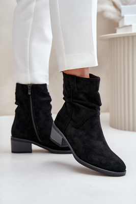 Ocieplane Botki Damskie Z Marszczoną Cholewką Na Niskim Obcasie Czarne Zinanya