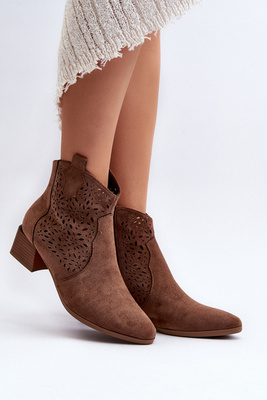 Zazoo 3305 Damskie Ażurowe Botki Kowbojki Na Niskim Obcasie Zamszowe Cappucino