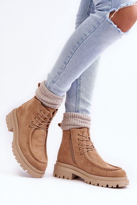 Zamszowe Ocieplane Botki Workery Na Płaskim Obcasie Ciemnobeżowe Nacelle