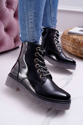 Botki Damskie Płaski Obcas Militarne Lakierowane Czarne Bemmer