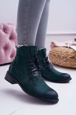 Skórzane Zielone Damskie Botki Z Koronką Millano