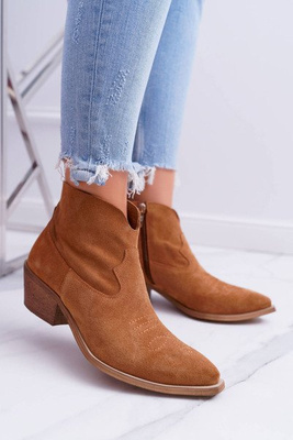 Botki Damskie Płaski Obcas Wiosenne Skórzane Kowbojki Camel Batty