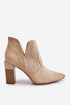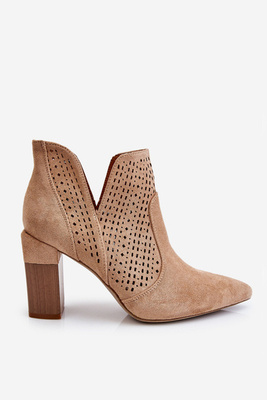 Modne Zamszowe Ażurowe Botki Na Obcasie Jasnobeżowe Genevi
