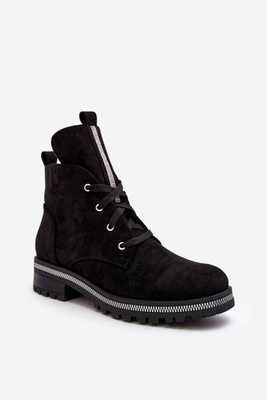 Zamszowe Botki Na Płaskim Obcasie Sznurowane Czarne Lakyta