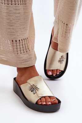 Skórzane Klapki Damskie Ze Złotą Ozdobą Na Koturnie Vinceza 41444 Złote