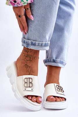 Damskie Klapki Na Platformie Z Ozdobą Białe Beneca