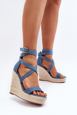 Jeansowe Sandały Na Koturnie Z Plecionką Niebieskie Salthe