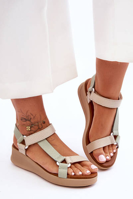Wygodne Skórzane Sandały Na Koturnie Beżowo-Brązowe Tifena