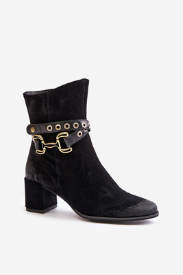 Zamszowe Botki Damskie Na Słupku Z Ozdobnym Paskiem Maciejka 06679-01 Czarne