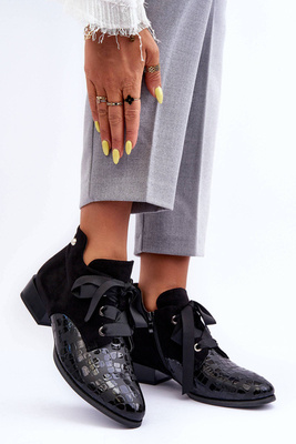 Damskie Półbuty Na Płaskim Obcasie Z Wiązaniem Czarne Meroni - Zamsz