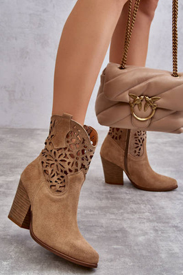Zamszowe Ażurowe Botki Kowbojki Lewski Shoes 3265 Ciemnobeżowe