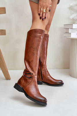 Zazoo 70140 Skórzane Kozaki Damskie Przed Kolano Ocieplane Brązowe