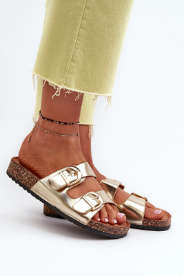 Klapki Damskie Z Ozdobą Eko Skórzane Na Płaskim Obcasie Złote Sadria