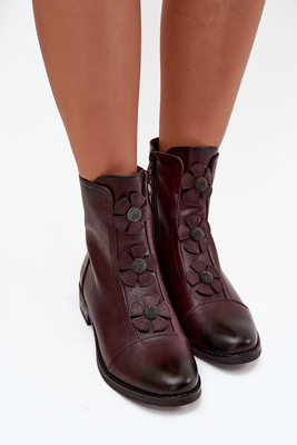 Ocieplane Botki Damskie Na Płaskim Obcasie Z Ozdobnymi Kwiatkami Bordowe Pravienne