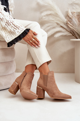 Eko Zamszowe Damskie Botki Na Słupku Ocieplane Ciemnobeżowe Meriluna