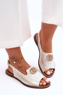 Skórzane Płaskie Sandały Z Ozdobą Nicole 2744/004 Biało-Złote