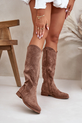 Ażurowe Kozaki Damskie Na Niskim Obcasie Eko Zamszowe Zapinane Na Zamek Ciemnobeżowe Orchides