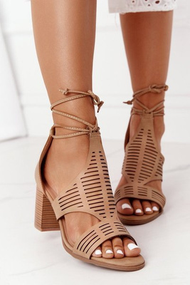 Wiązane Ażurowe Sandały Na Słupku Beżowe Lorette