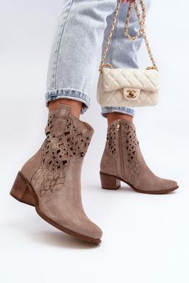 Zazoo 3166/P Damskie Ażurowe Botki Na Obcasie Zamszowe Beżowe